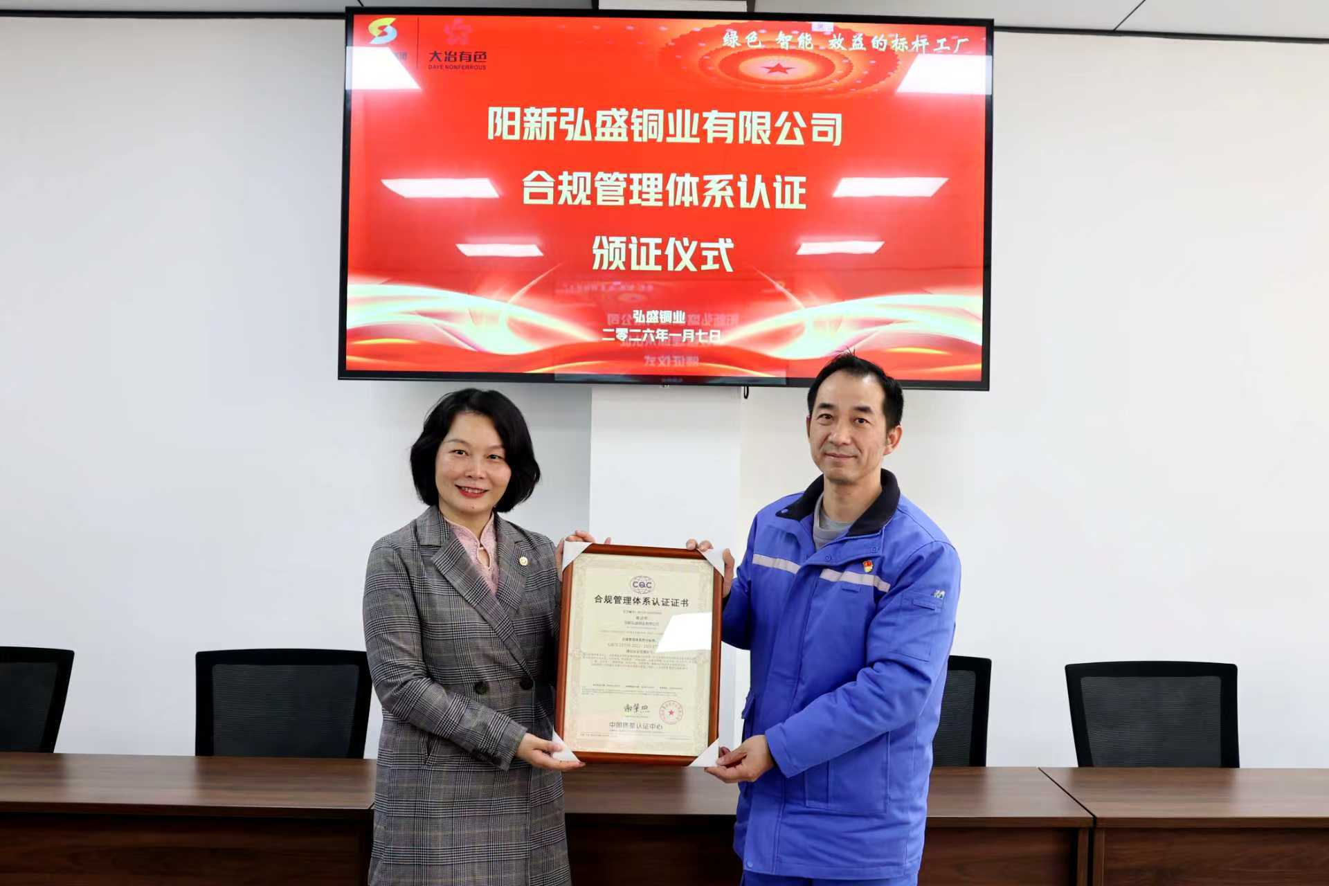 阳新弘盛铜业董事长骆祎在交流中表示,此次获证是对公司合规管理工作的权威认可,更是企业高质量发展的重要里程碑。正值“十五五”开局之年,公司将以此次获得国际国内双认证为契机,以合规管理体系为抓手,持续深化合规文化建设完善全领域合规管控,筑牢经营发展“安全防线”为有色金属冶炼行业现代化产业体系规范发展贡献力量。